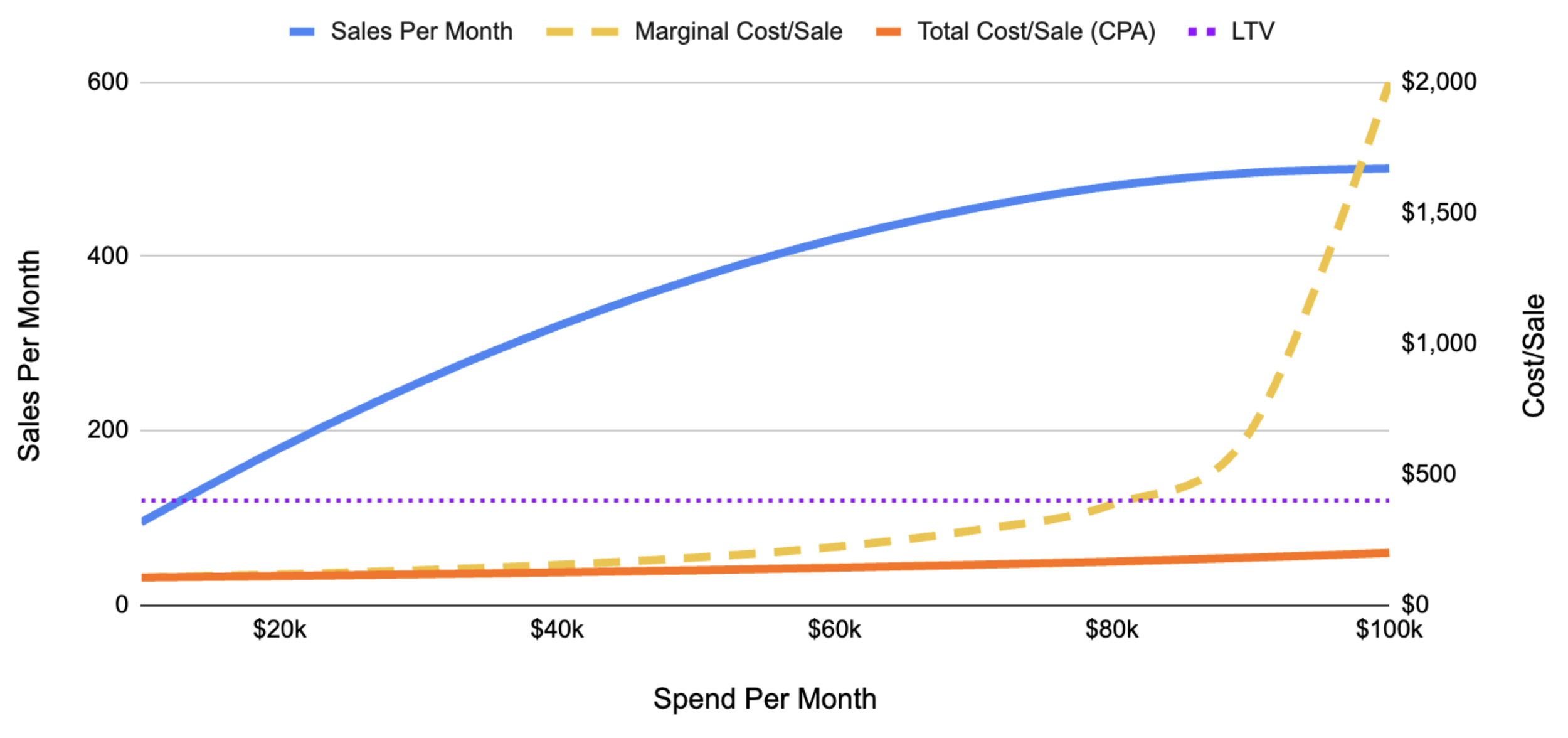 After LTV, the very next thing to factor into any media target is diminishing returns. In a well-optimized program, each additional sale becomes more expensive. That means if your CPA target is set equal to your LTV, your latest sales are likely costing more than they are worth.