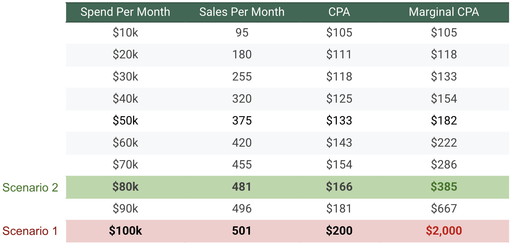 In scenario 1 your CPA never even reaches your $400 LTV, so you are ‘ROI positive’. However, the marginal CPA (cost of the next sale) is $2,000. I can fairly certainly say nobody wants to pay $2,000 for a $400 sale.